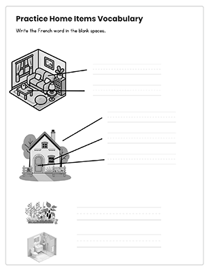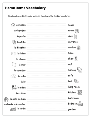 Words included: la maison, la chambre, la porte, l’entrée, la fenêtre, la table, la chaise, le mur, le corridor, le sofa, le lit, le salon, la cuisine, la salle de bain, la chambre à coucher, le jardin.