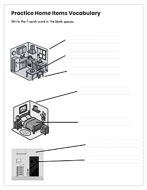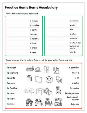 Complete introduction to house-related vocabulary in French. Students learn 16 words with icons, write translations, match to pictures, color feminine articles red, and label real-life scenes (kitchen, bedroom, living room, etc.).
