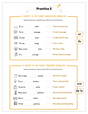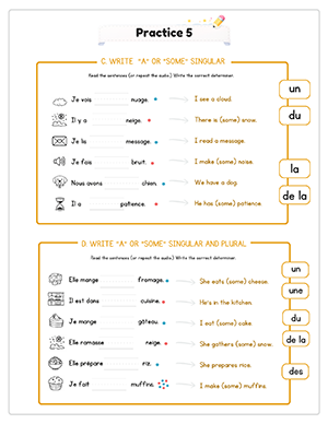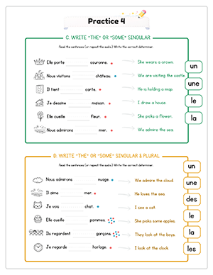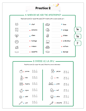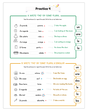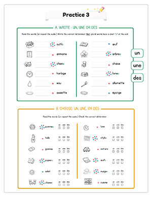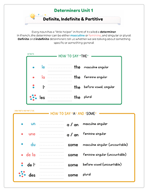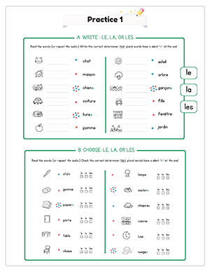 This unit includes 14 structured audio files to guide pronunciation and reinforce learning. Students hear vocabulary, determiners, and sentence patterns spoken clearly, helping them practice masculine and feminine agreement while reducing direct teacher instruction time.