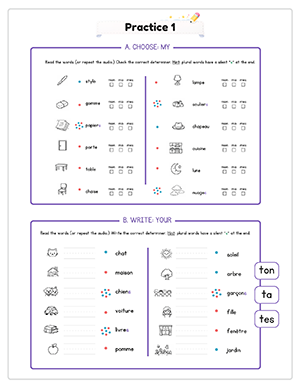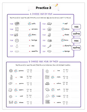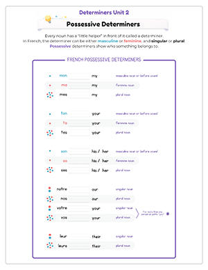 This unit includes 6 focused audio files that model correct pronunciation of possessive determiners and vocabulary. Students practice listening and repeating while strengthening agreement with masculine, feminine, and plural nouns.