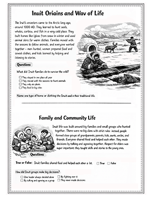 printable worksheet set. Students learn about Inuit origins, how families
