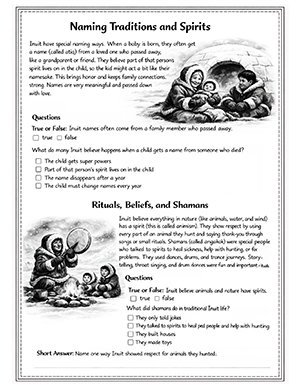A 9-page printable unit introducing children to Inuit culture, Arctic geography, seasonal life, and the Inuktitut language through engaging worksheets.