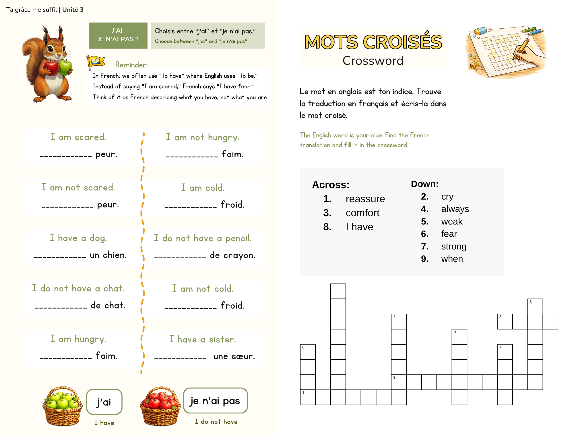 • Gentle grammar exposure such as Je n’ai pas, simple present tense verbs, and helpful reminders like je = I, tu = you